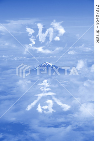 用雲彩繪製的“歡迎來到新年”的角色,從天空拍攝的雲海和富士山的風景圖像