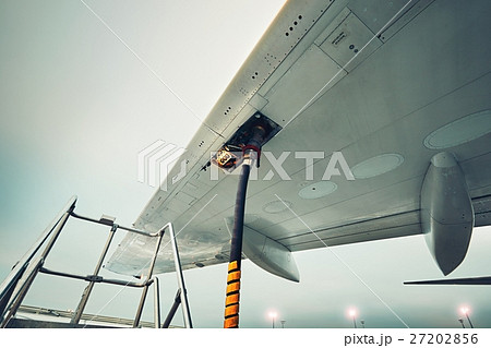 Refueling the aircraft at the airport before departure. The white plane is on the platform, the passengers sit through the boarding bridge. Handling service