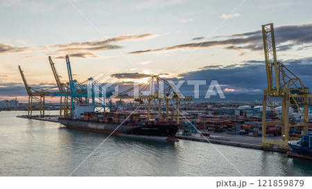 Aerial view of the sea cargo port and container terminal of Barcelona timelapse, Barcelona, Catalonia, Spain.