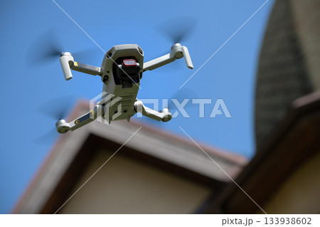 Drone in the air inspecting the roof over the house closeup blue sky background