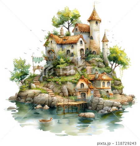 A whimsical fairytale cottage on a small island with a wooden dock and a boat in the water.