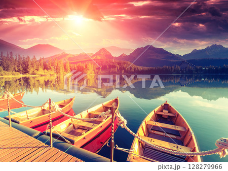 帆船漂浮在夕陽天空下的海上,背景是山脈