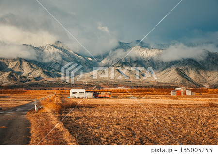冬日陽光明媚的日子裡,陽光、藍天、雲彩、雪地、小屋、私人住宅和鄉村山脈的白光