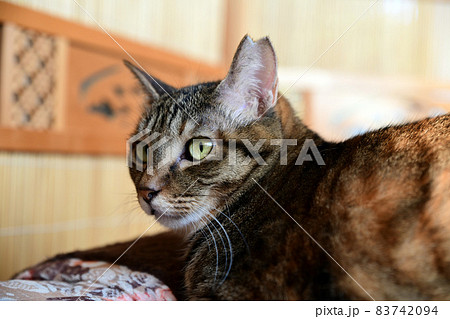 神誌清醒又有點緊張的木頭貓。和貓一起生活。圖片素材