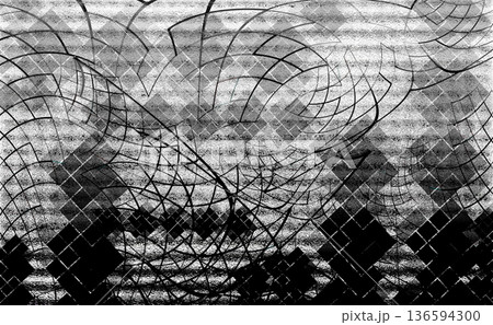 以扭曲的幾何形狀、方塊圖像等圖案為設計元素的插圖裝飾和壁紙,疊加在類似石頭的背景上。