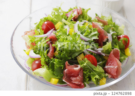 色彩鮮豔的生菜和火腿沙拉