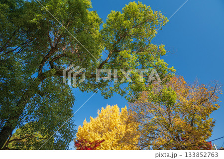 秋葉色彩斑斕,在藍天的襯托下格外醒目。