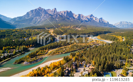 Aerial view of Canadian Rockies mountain range and Bow river forest in autumn morning. Canmore, Alberta, Canada. Mount Rundle.