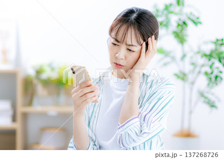 一位年輕女子一臉憂慮地看著她的智慧型手機