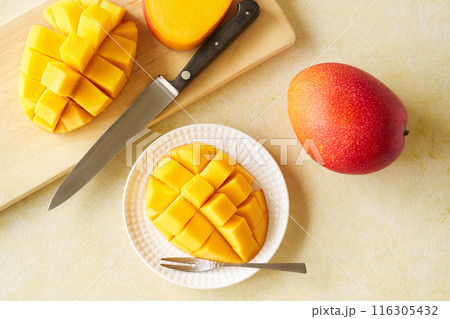 水彩芒果_用葉子切芒果和芒果_用葉子
