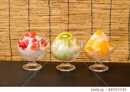 草莓、芒果、葡萄三種口味的刨冰,清涼夏日甜點。