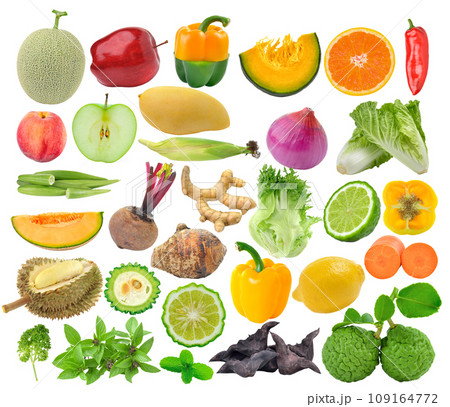 melon; creeper; apple; Beetroots; corn; tumeric; taro; mango; onion; pepper; pumpkin; bitter melons; durian; lettuce; bergamot; orange; Water Caltrops; basil; lemon; carrot; parsley; mint on white