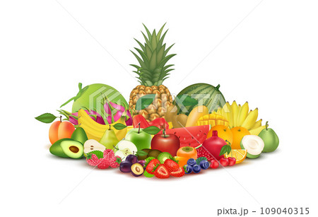 Organic fresh set of different vegetables and juicy fruits healthy food. Natural supplements vitamins and minerals. Medical health concept. On white background. 3D Realistic vector illustration.