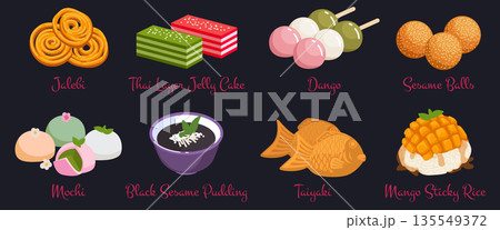 Traditional food. Thai dessert. Asian healthy snack. Indonesian cake. Nutrition drawing. Colorful dish. Menu sticker. Taiyaki and dango. Sesame buns. Japanese mochi. Vector oriental sweet meals set
