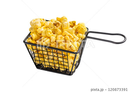 Cheese and caramel sweet popcorn in a basket isolated on white background