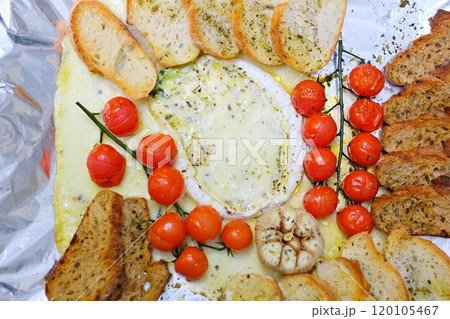 French cuisine. Baked Camembert cheese with garlic, thyme and toasted bread.