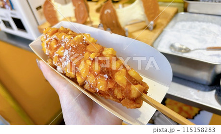Korean street food. Corn dog with sauces, fried chicken on skewers, fish vegetables rolls. Takeaway asian restaurant meals, winter snacks, racy vector clipart