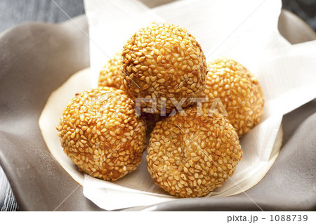 芝麻餃子的特寫鏡頭,裡面有很多芝麻。中國甜油炸糖果,裡面有紅豆醬。