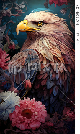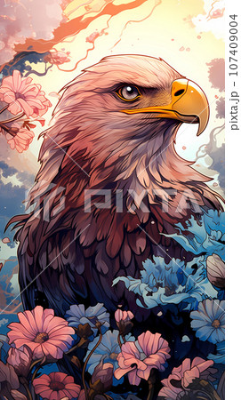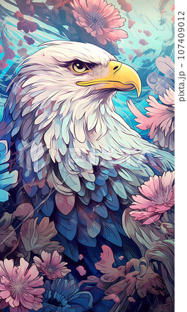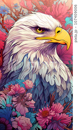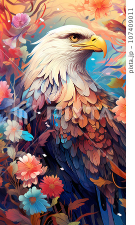 手绘卡通花丛中的白头鹰插画