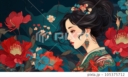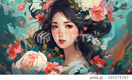 手绘卡通花丛中的中国女孩插画