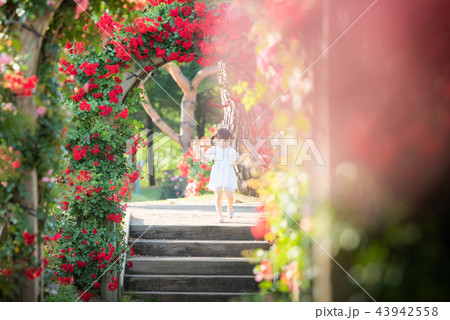 女孩兒童花園樹木園上升了