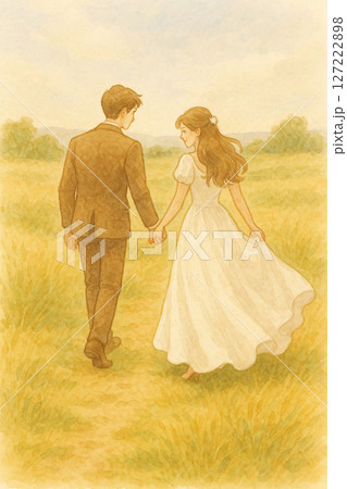 田野裡牽手的情侶 | 婚禮插畫 | 田野裡牽手的情侶的浪漫時刻