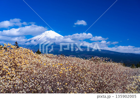 [富士山素材] 從白絲自然公園眺望富士山與三椏花 [靜岡縣]