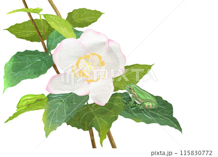 樹蛙看著梅花天空樹葉子上的花朵的插圖