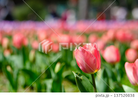 陽光照射下,一片鮭魚粉紅色的鬱金香花田以低角度特寫鏡頭拍攝。
