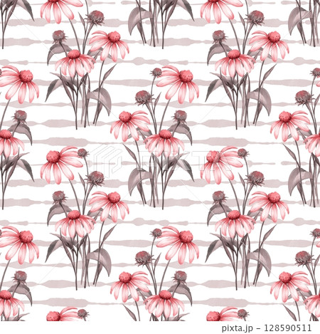 Delicate pink echinacea flowers, seamless pattern with striped background