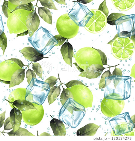 Seamless pattern with limes and ice cubes. Hand drawn vibrant background with fruits and leaves. Design for wrapping paper, cards, textile and etc.