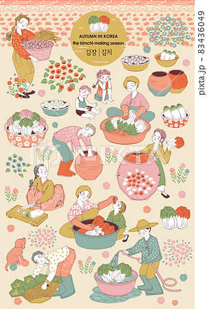 Autumn in Korea, the Kimchi-making season. Vector illustration icons set of Korean town people and family Making Kimchi.