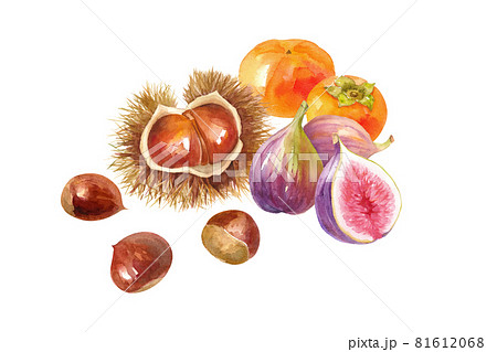 秋季水果的集合。栗子、柿子和無花果的水彩插圖。可以更改佈局(矢量數據)。
