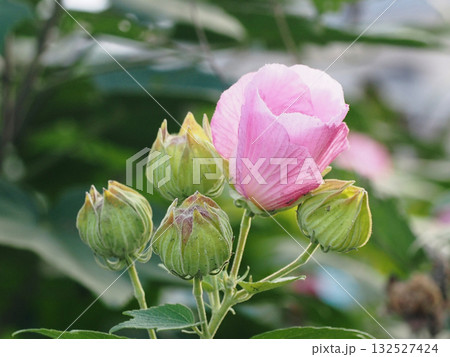夕陽下的粉紅色扶桑花(秋季扶桑花和花苞的特寫)