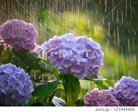 在雨季陽光明媚的日子裡,柔和的淡紫色繡球花盛開