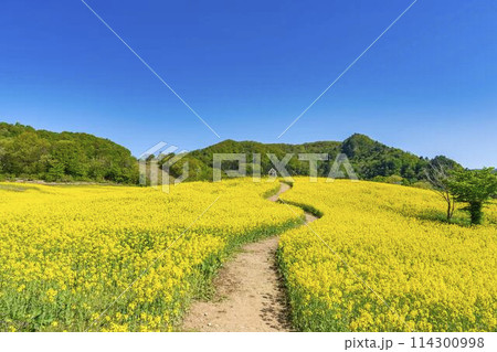 初夏盛開的油菜花,福島縣喜多方市三倉高原的花田