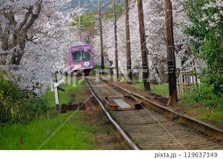 春季嵐山北野線和經過的列車