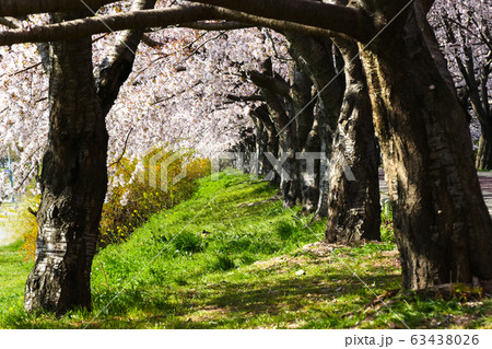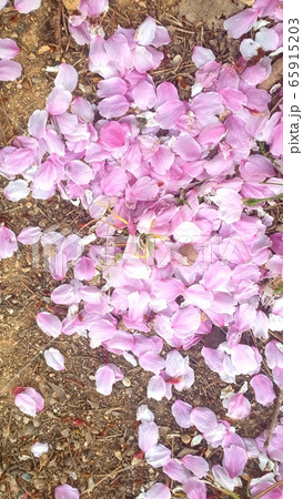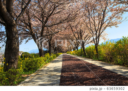 4月早晨,酸公園長廊上的土壤沾滿了櫻花