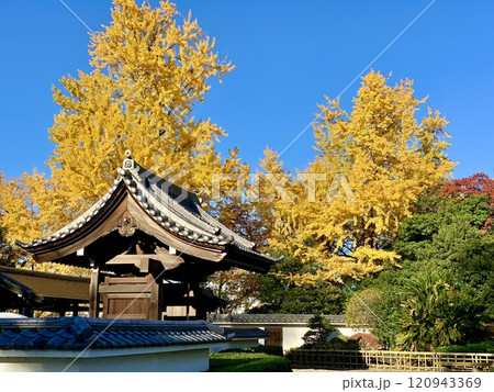 京都的秋天,今宮神社的道路,今宮門前街的銀杏樹和瓷磚牆