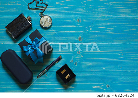 A gift with a blue ribbon, a pocket watch on a chain, cufflinks and a case with glasses on a blue background