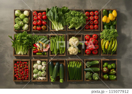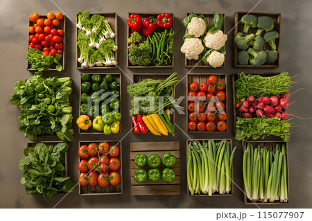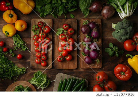 新鮮的各種蔬菜分類整齊擺放在木板上