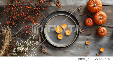 Celebrate Autumn, Arrange orange slices and pumpkins for seasonal kitchen decor concept