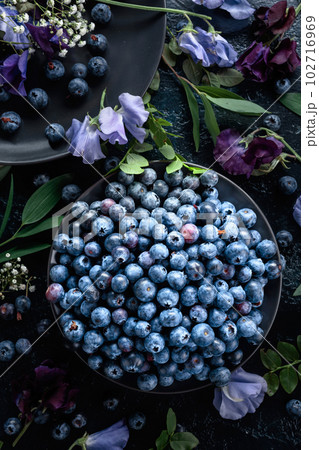 A mix of dry flowers, leaves, petals, and other plant parts. Potpourri background. Purple and blue tone leaves, white color and wood grain background shot.