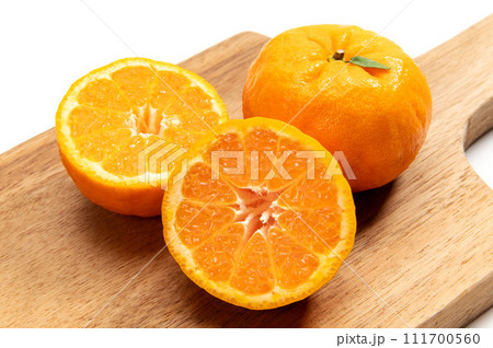 Orange segments, in a wooden bowl. Segments of a peeled Valencia orange. A ripe and sweet fruit with yellow, and juicy fruit flesh. Close-up from above, isolated on white background, macro food photo.