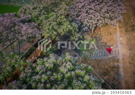 在夏天, 盛開的粉紅色和紫色美麗的苦楝花放在紅色的帽子裡