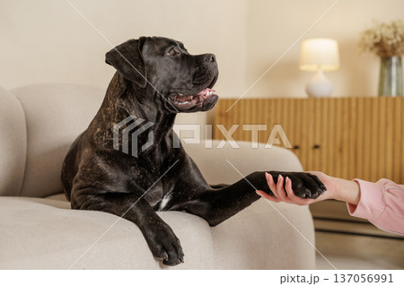 Brindle Cane Corso lying on a sofa giving paw to a person hand in a cozy living room. Domestic guard dog interaction showing trust, training, and companionship.