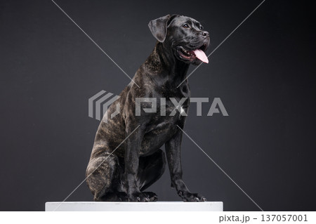 Muscular brindle Cane Corso sitting on a pedestal in a dark studio setting, panting with tongue out. Powerful guard dog portrait with copy space.