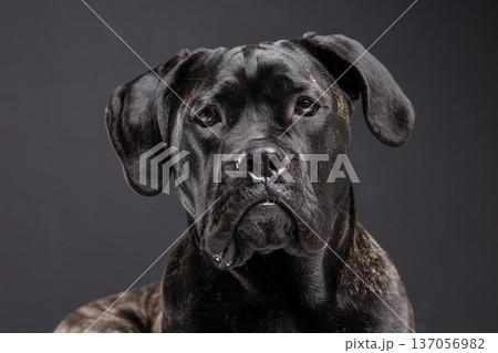 Closeup portrait of a brindle Cane Corso looking forward with a focused, calm expression in a dark studio background. Powerful purebred guard dog with copy space.