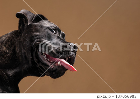 Close up side portrait of a brindle Cane Corso panting with tongue out on a warm studio background. Powerful purebred guard dog isolated with copy space.