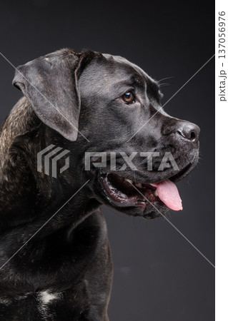 Closeup portrait of a brindle Cane Corso panting with mouth open, facing the camera in a dark studio background. Powerful purebred guard dog with copy space.